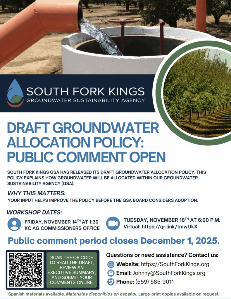 SFKGSA Hosting Workshops on Groundwater Allocation Policy November 11, 2025 in Agency Updates Friday November 14. 2025 at 1:30 PM
