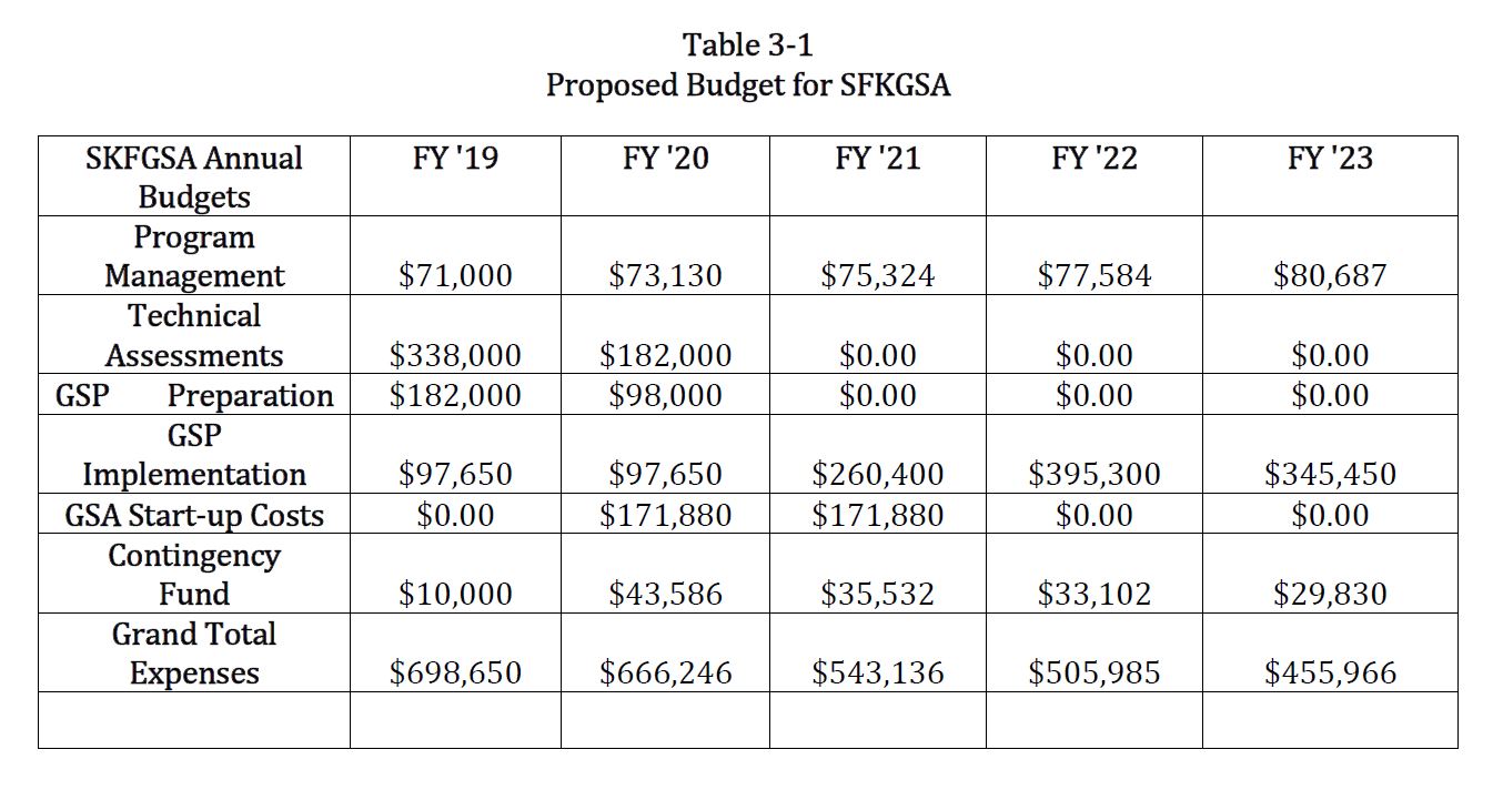 The Engineer’s Report outlines the South Fork Kings GSA’s five-year projected operating costs and expenses associated with the development and initial implementation of a Groundwater Sustainability Plan as required by SGMA, ongoing administration, technical assessments, and recovery startup costs incurred by the South Fork Kings member agencies. Click image below to enlarge.